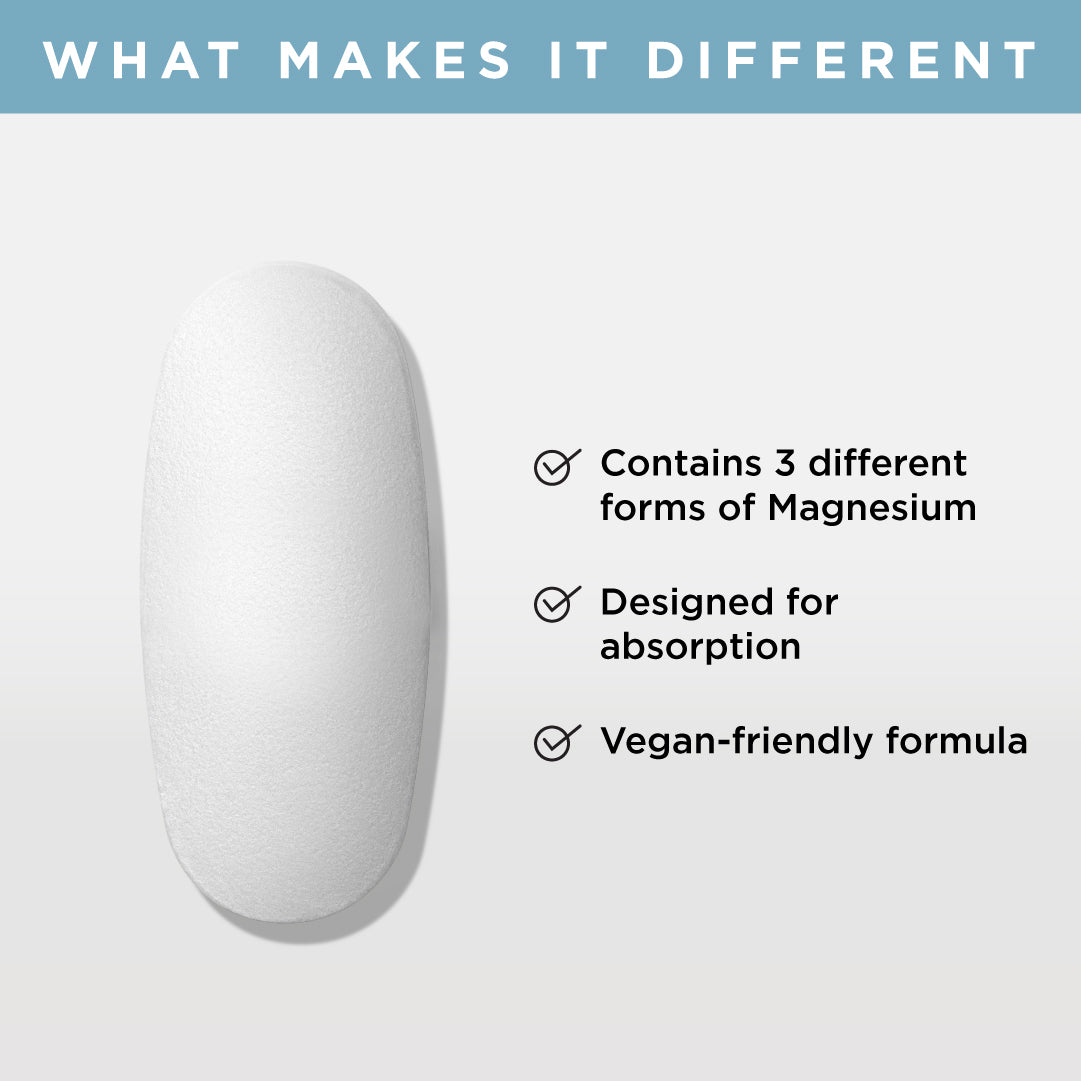 Advanced Magnesium+ contains three forms of Magnesium in a formula carefully designed for absorption. Discover relaxation and restoration in just 2 tablets a day.