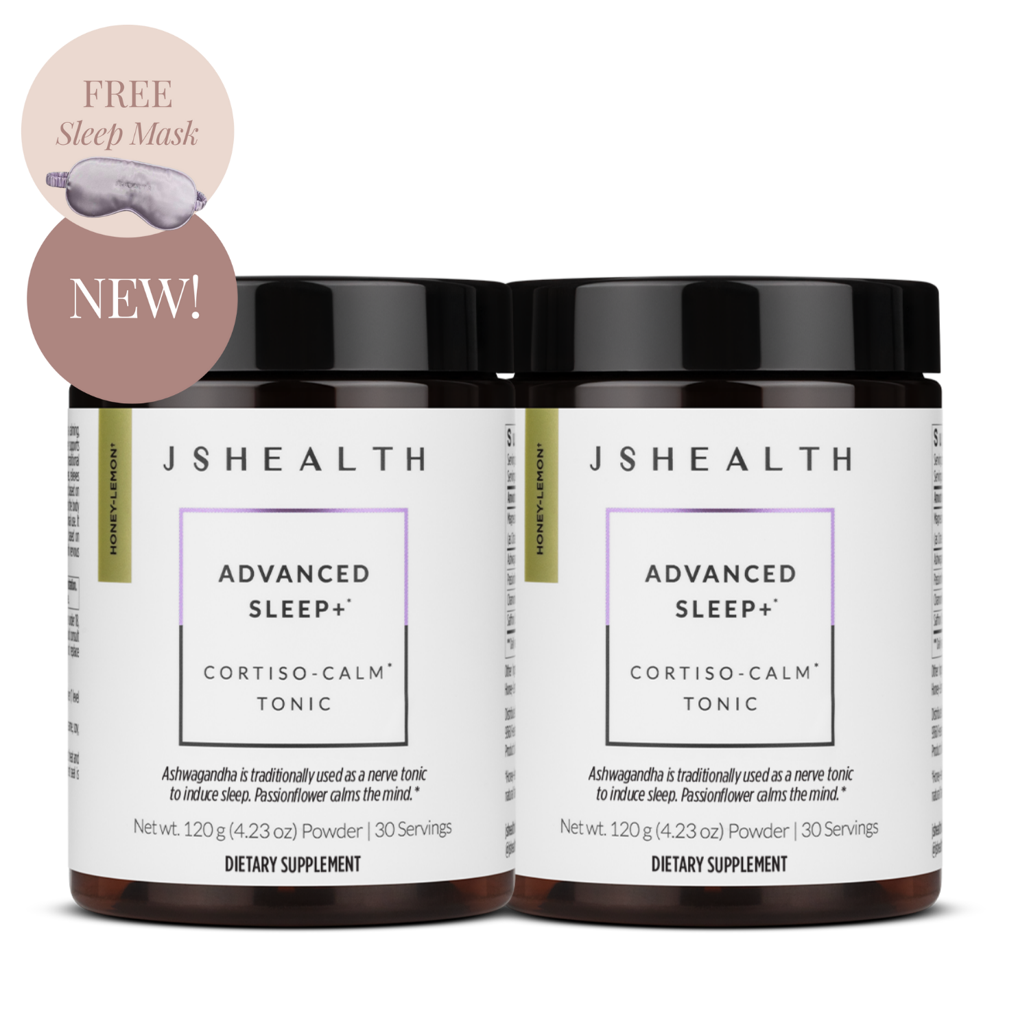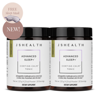 The JSHealth Advanced Sleep+ formula contains Passionflower, Ashwagandha, Magnesium, Chamomile, and Saffron in a Honey-Lemon flavored powder.