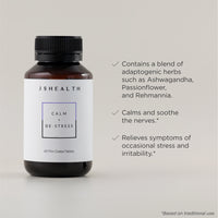 The JSHealth Calm + De-Stress formula contains Ashwagandha, Passionflower, Vitamin B5 and Vitamin C.
