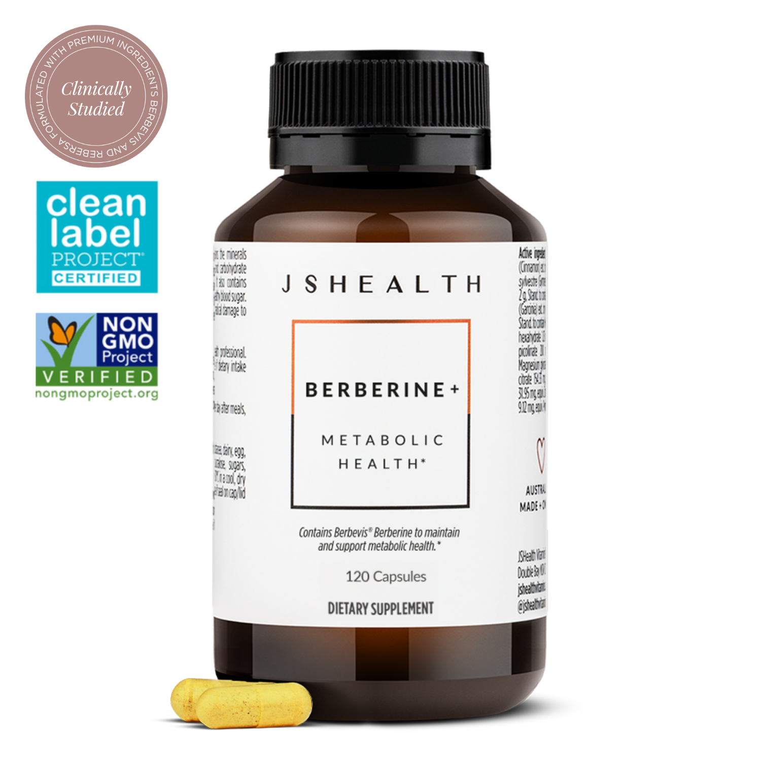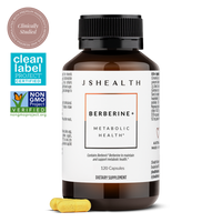 The JSHealth Berberine+ formula contains Berbevis® Berberine phospholipid, Rebersa® Berberine hydrochloride, and Gymnema.