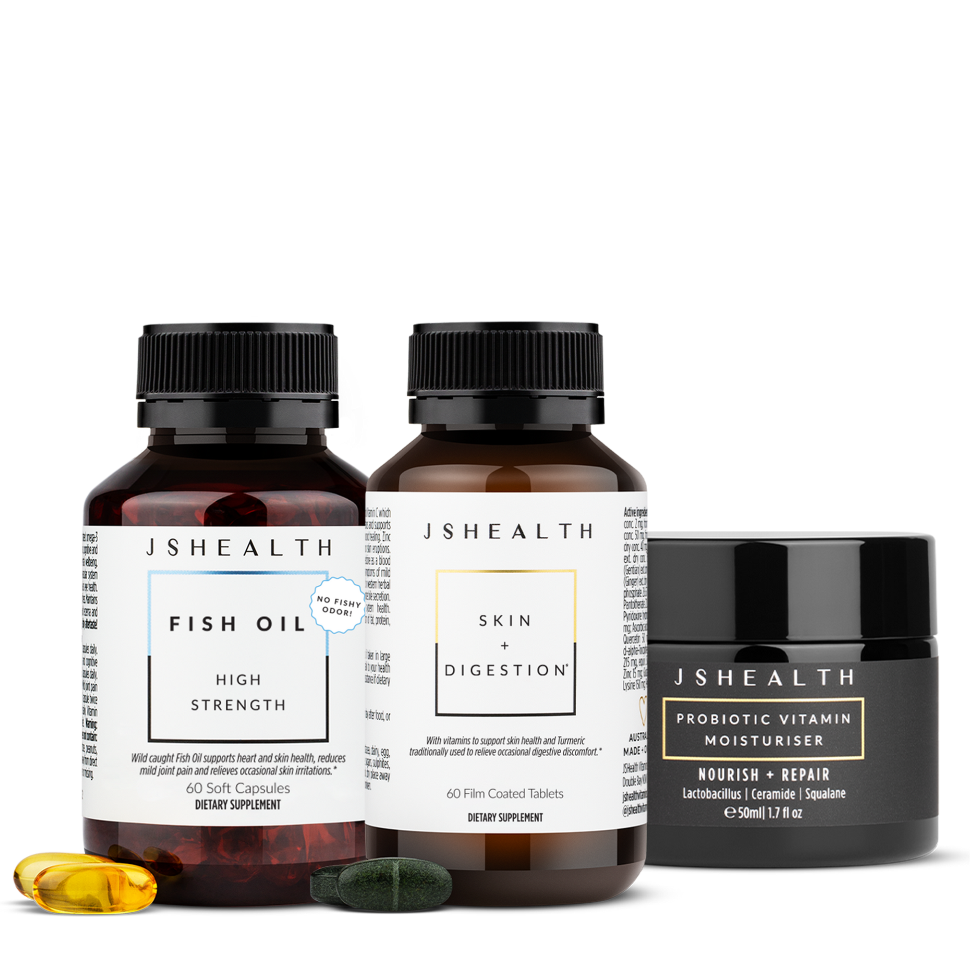 Jess' ultimate trio for healthy, clear skin. Our Clear Skin Trusted Trio contains the Fish Oil (60s) and Skin + Digestion formulas, along with the Probiotic Vitamin Moisturiser.