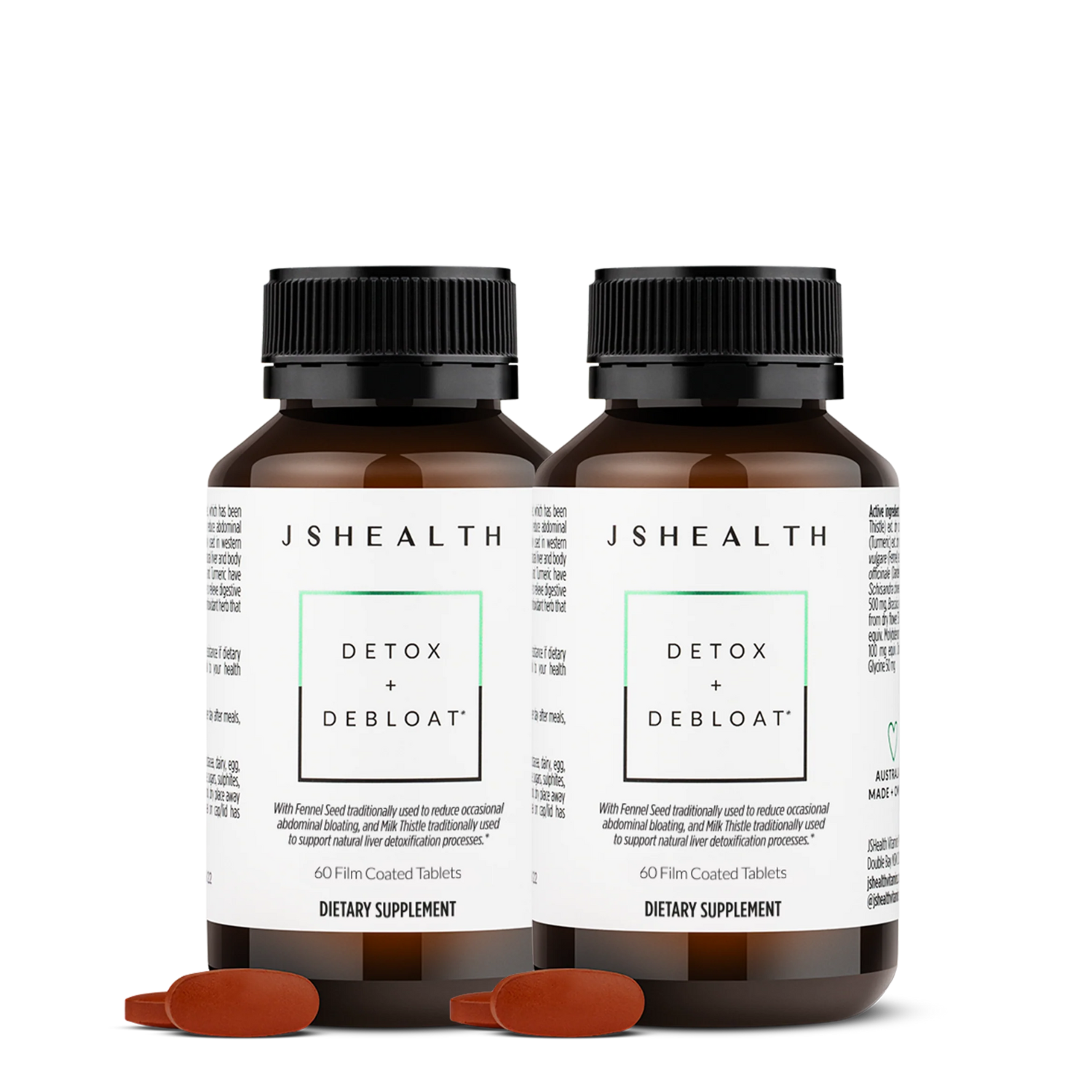 The JSHealth Detox + Debloat formula contains Milk Thistle, Fennel Seed, and Turmeric.