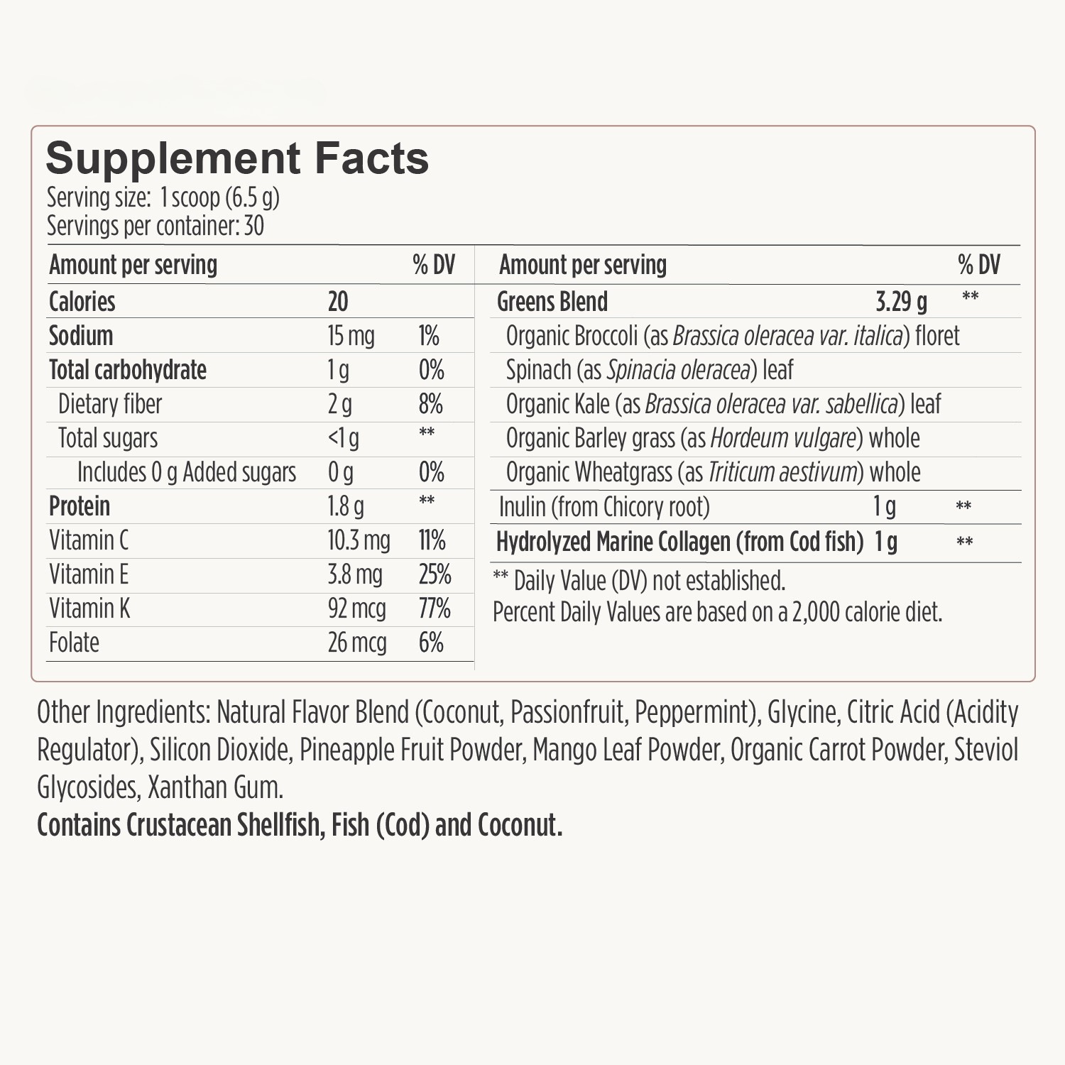 Each 6.5g serve contains: Greens Blend (Organic Broccoli floret, Spinach leaf, Organic Kale leaf, Organic Barley grass, Organic Wheatgrass) 50.8%, Hydrolyzed Marine Collagen (Fish) 15.4%, Inulin (from Chicory root), flavor blend (Coconut, natural Passionfruit, Peppermint oil), Glycine, Acidity regulator (Citric acid), Colloidal anhydrous silica, Pineapple fruit powder, Mango leaf powder, Organic Carrot powder, Sweetener (Steviol glycosides), Thickener (Xanthan gum). Contains Fish.