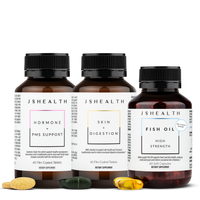 Jess' ultimate trio for gut/skin care and month-round support. Our Glow + Flow Trusted Trio contains the Skin + Digestion, Hormone + PMS, and Fish Oil (60s) formulas.