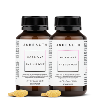 The JSHealth Hormone + PMS Support formula contains Chaste Tree, Dong Quai, B Vitamins, and Magnesium.