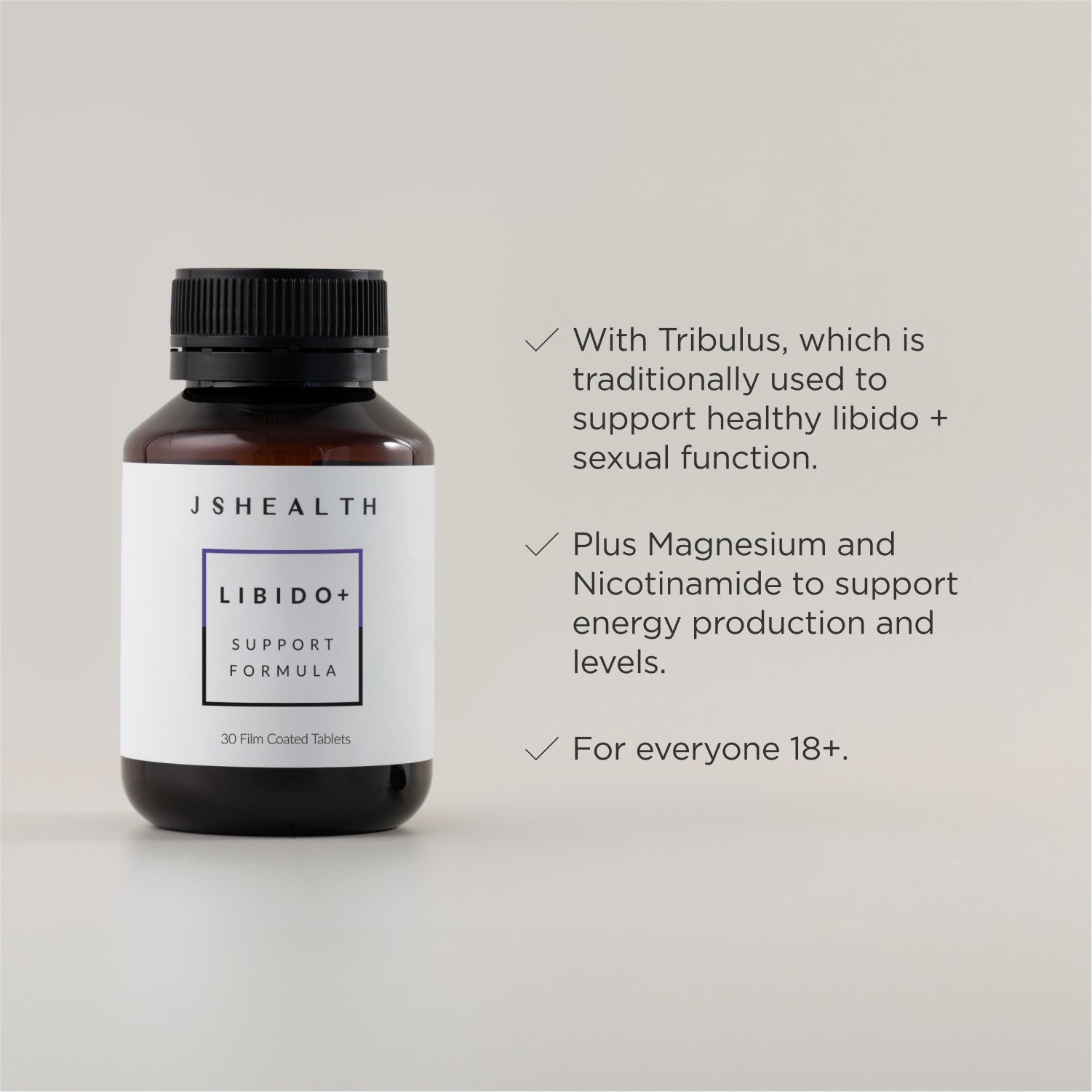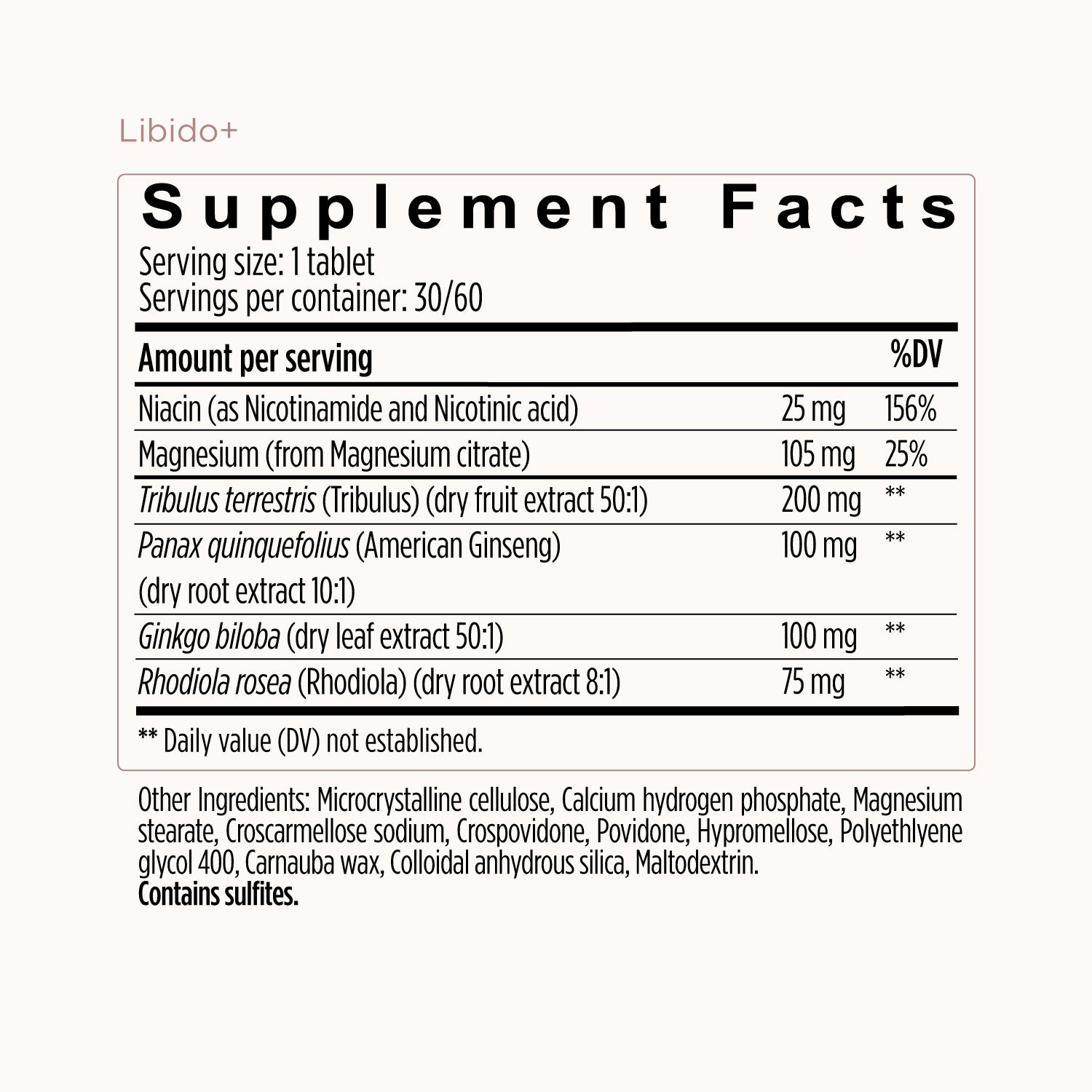 Libido+ contains ingredients purely to support a healthy libido, sexual function, nervous system, and general well-being. It features Tribulus, Ginseng, Rhodiola, and Magnesium.*