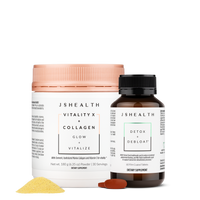 Jess' ultimate pair to support liver health, a vibrant cleanse, and a luminous glow. Our Liver Reset Perfect Pairing contains our best-selling Detox + Debloat formula along with our Vitality X + Collagen powder.