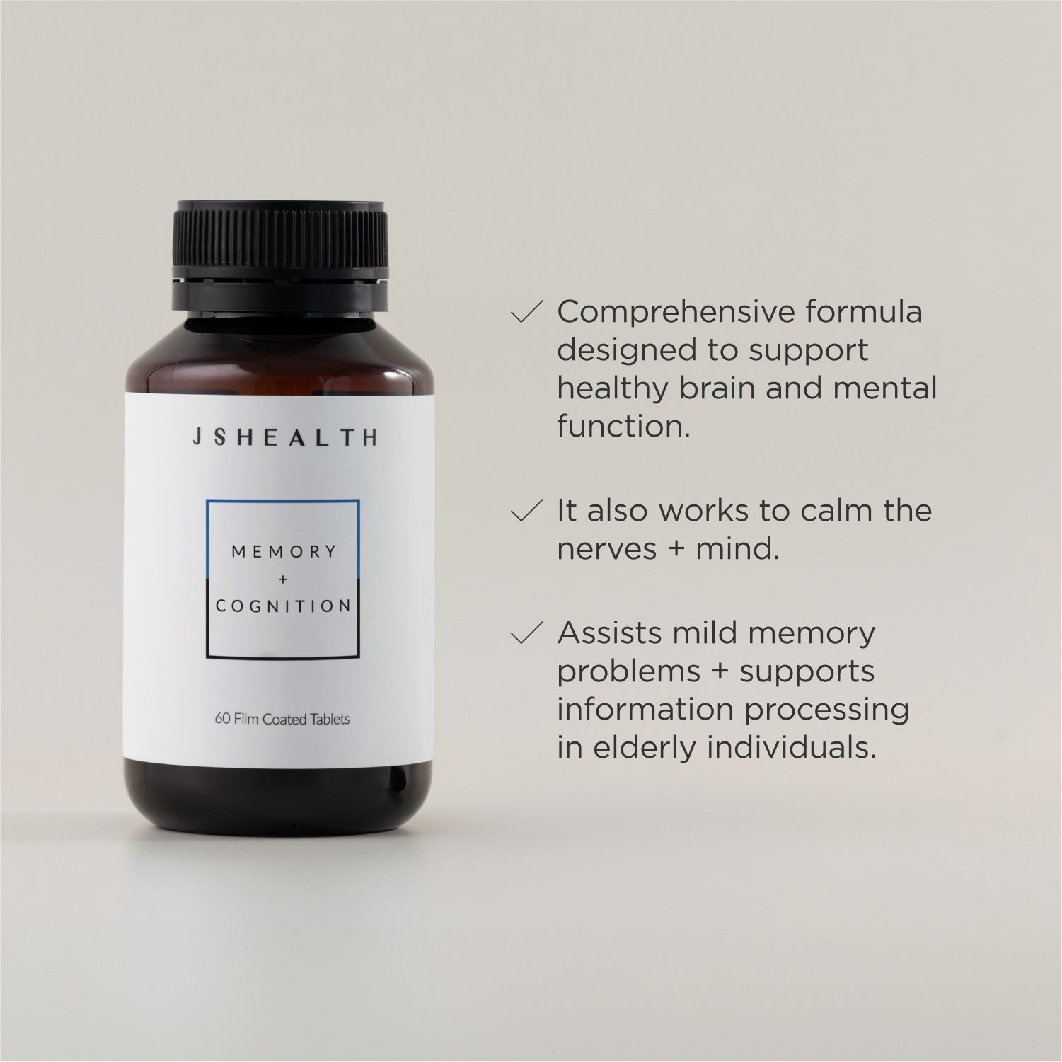 The JSHealth Memory + Cognition formula contains Brahmi, Lemon Balm, Vitamin B6, and more.