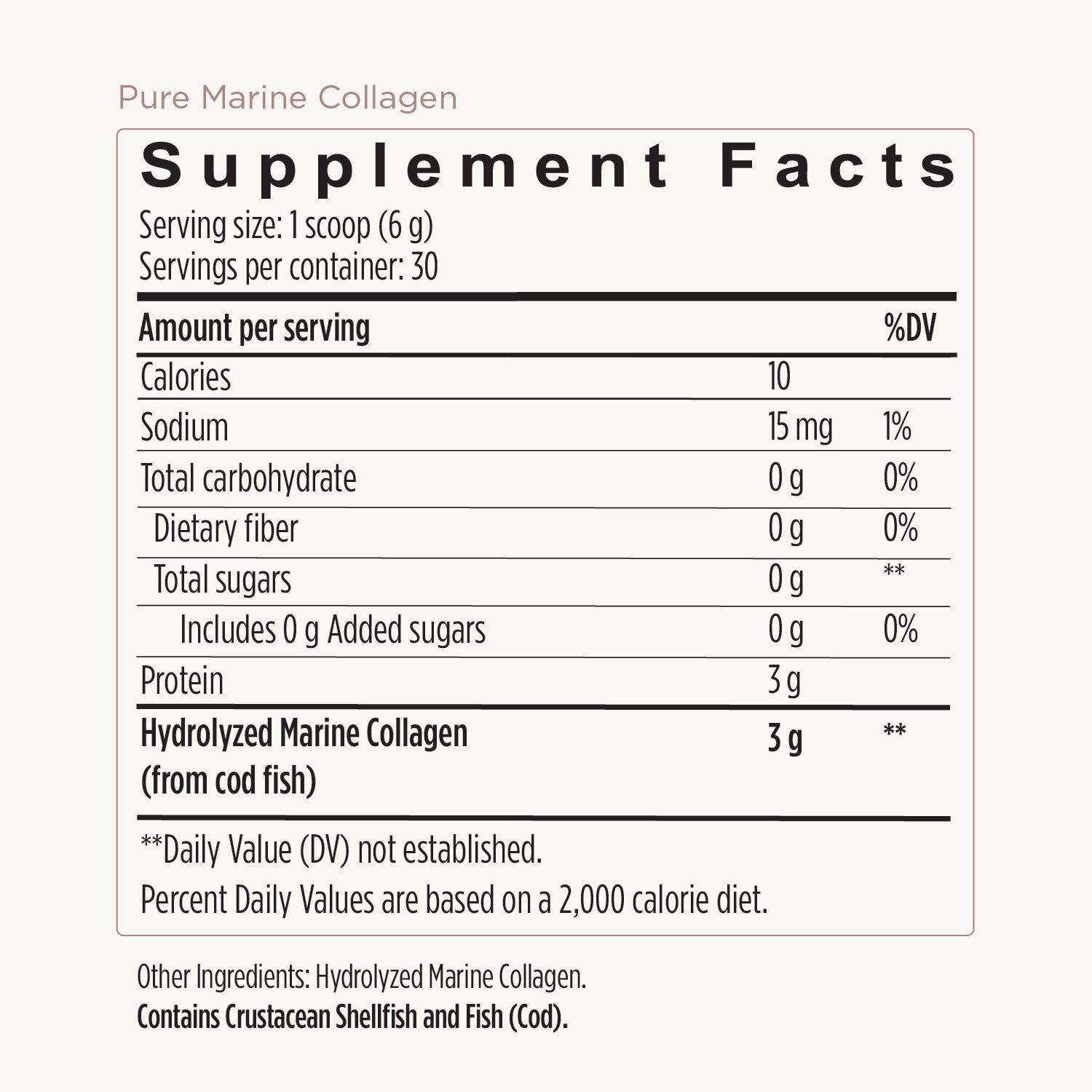 Pure Marine Collagen contains pure, hydrolyzed Marine Collagen powder.