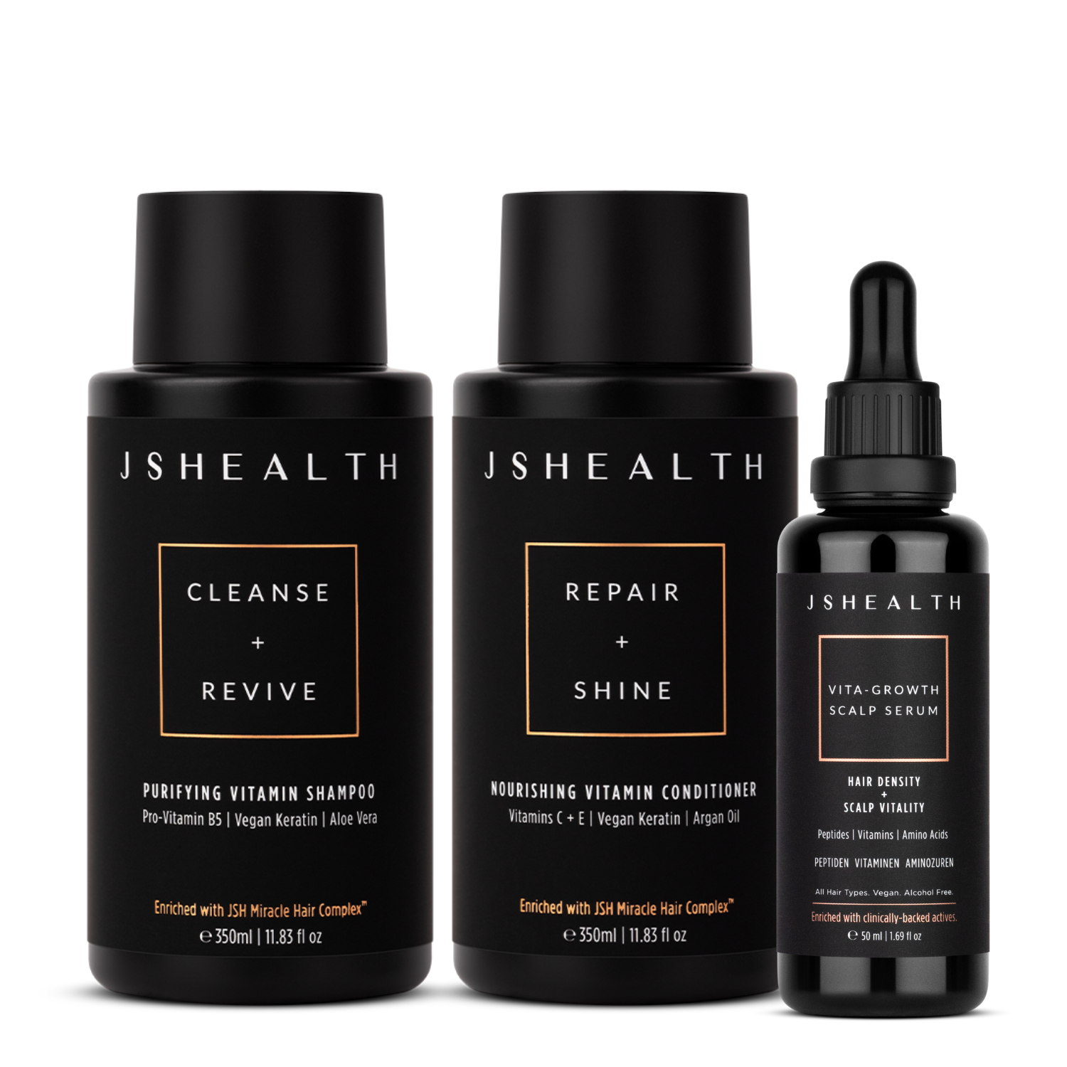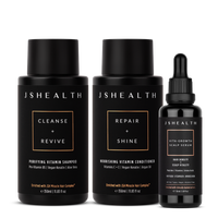 Our transformative topical system, designed with clinically-backed ingredients to reduce hair fall and restore thick, healthy hair. First, lightly lather and moisturize your way to softer, more vibrant hair with our Purifying Vitamin Shampoo. Followed by our Nourishing Vitamin Conditioner to protect the scalp, detangle strands, and add a surge of gloss-building shine. Finally, massage our Vita-Growth Scalp Serum at night (or morning and night for problem areas) to reujvenate the scalp and restore hair density with every drop.
