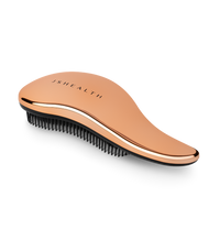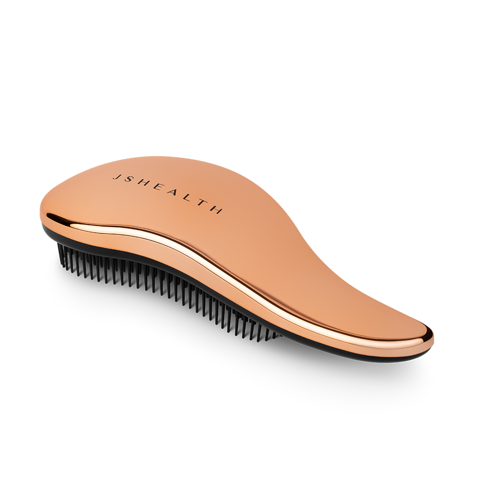 Complete your haircare routine with our exclusive JSHealth Vitamins Hair Brush, complete with signature logo. This stylish and considered design features black lightweight bristles to help protect and support hair whilst grooming, in a chic rose gold casing. The ergonomic handle ensures ease of use as you effortlessly detangle and smooth hair from scalp to ends. Whilst bushing, apply a gentle amount of pressure at the scalp to provide a massaging effect for enhanced blood flow to support healthy scalp skin and hair follicles.