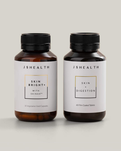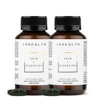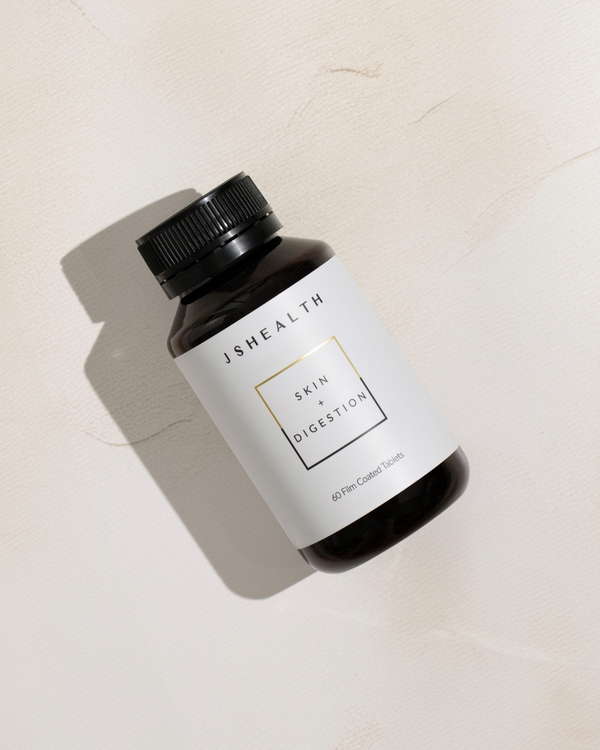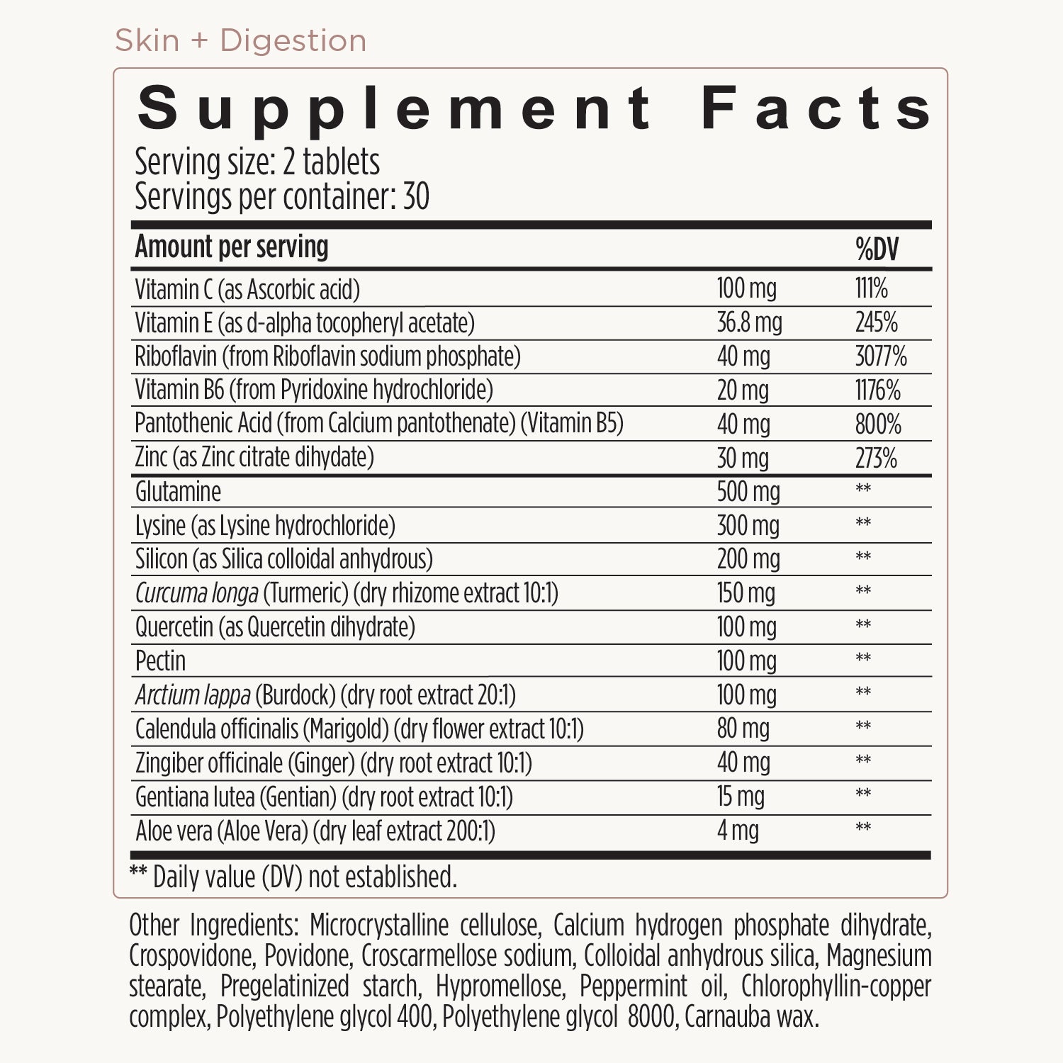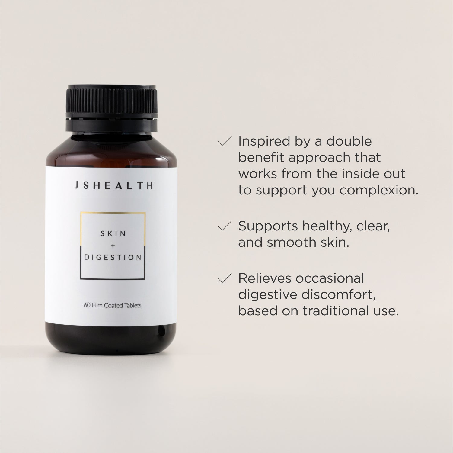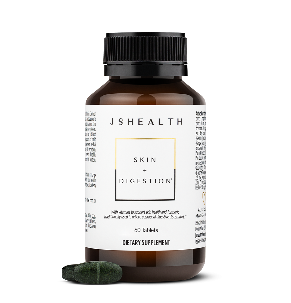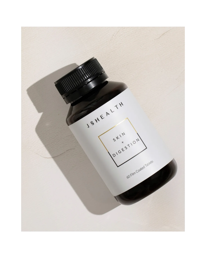 The JSHealth Skin + Digestion formula contains Vitamin B2, Vitamin C, Zinc, Burdock, and Turmeric.