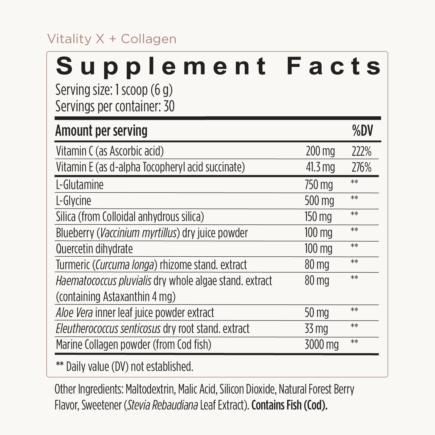 Say goodbye to fine lines and wrinkles with Vitality X + Collagen, our signature all-in-one inner beauty powder. This blend harnesses the benefits of sustainably sourced Marine Collagen (100% pure from wild cod skin) enhanced with clinically evaluated ingredients to support skin firmness, skin elasticity, and skin hydration in females.*