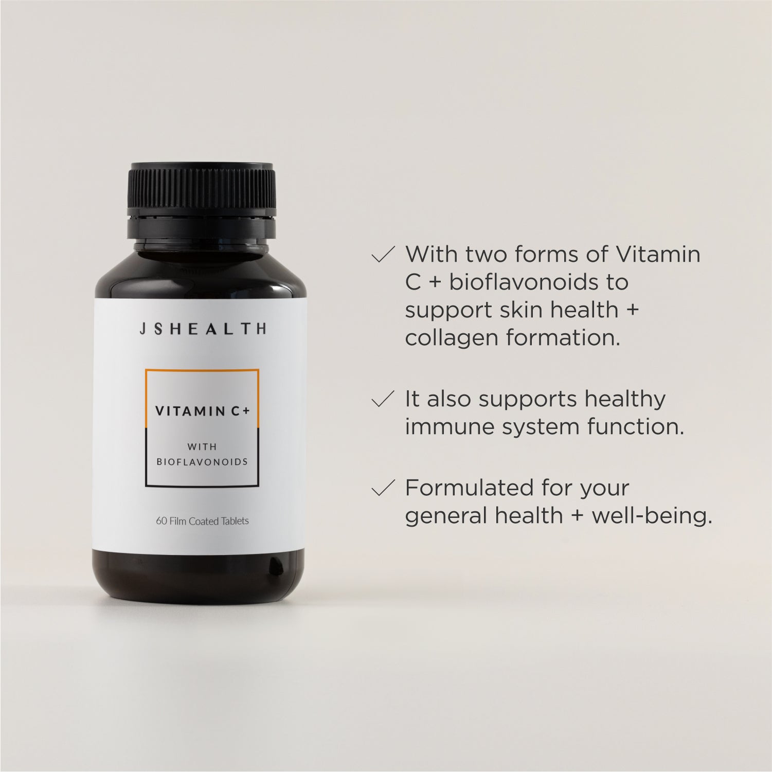 The JSHealth Vitamin C+ formula contains Vitamin C, Bioflavonoids, and Quercetin.