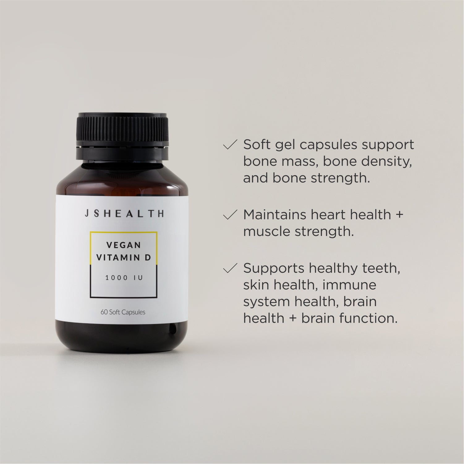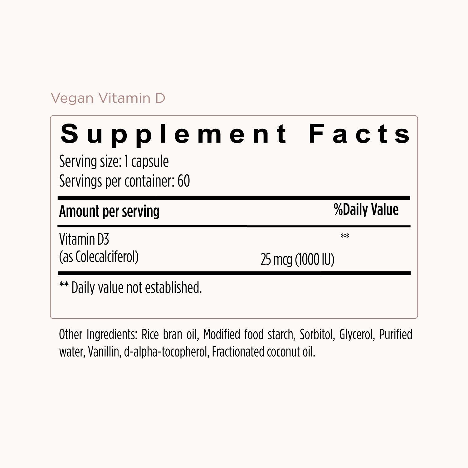 This premium vegan formula contains 1000 IU of plant-sourced Vitamin D3 in every tiny capsule, designed to maintain and support bone mass, density, integrity, and strength, plus support general health and well-being on the daily.*